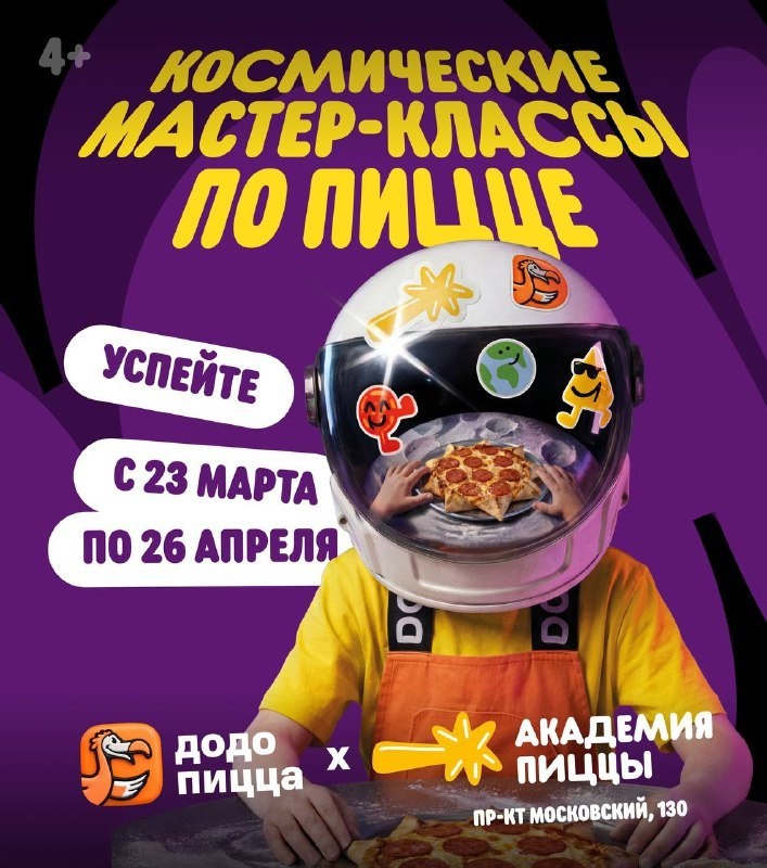 За один час ребята научатся самостоятельно готовить пиццу от замеса теста до подачи блюда. Участвуют все: замешивание теста, выбор ингредиентов, приготовление блюда под руководством опытных инструкторов. Завершают занятие юные повара дегустацией собственного творения и получением памятных подарков. Особое предложение – космический формат мастер-классов с 23 марта по 26 апреля. В программе: - создание оригинальной звездной пиццы; - увлекательные космические активности; - тематические сюрпризы и призы. Акция пользуется популярностью, свободные места ограничены. Рекордно короткие сроки записи: успейте забронировать место для незабываемого дня вашего ребенка!
