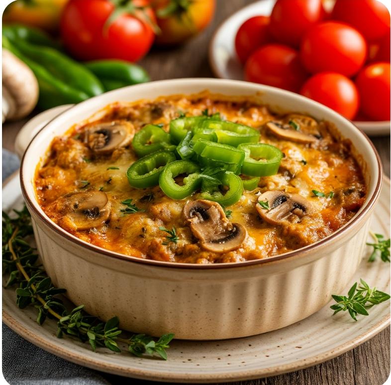 Это сытное и полезное блюдо каждый сможет приготовить у себя дома. В запеканке сочетаются вкусы грибов, куриного фарша и свежих овощей. Получается блюдо ароматным, с приятной сырной корочкой и легкой пряной ноткой благодаря розмарину и тимьяну. Для начала разогрейте духовку до 180 ºС. Грибы тщательно промойте и нарежьте на четвертинки, если они крупные. Капусту (брокколи или цветную) разберите на небольшие соцветия, чтобы они равномерно пропеклись. Моцареллу натрите на крупной терке, а твердый сыр — на мелкой, чтобы он хорошо расплавился и покрыл блюдо сверху. Чеснок и перец чили измельчите мелко, чтобы они равномерно распределились по запеканке и добавили пикантности. Лук нарежьте тонкими полосками, а болгарский перец — небольшими брусочками. В глубокой сковороде обжарьте грибы. Они должны приобрести приятный золотистый цвет. После того как грибы поджарятся и уменьшатся в объеме, переложите их на тарелку. В той же сковороде слегка обжарьте лук до золотистого оттенка. Затем добавьте к