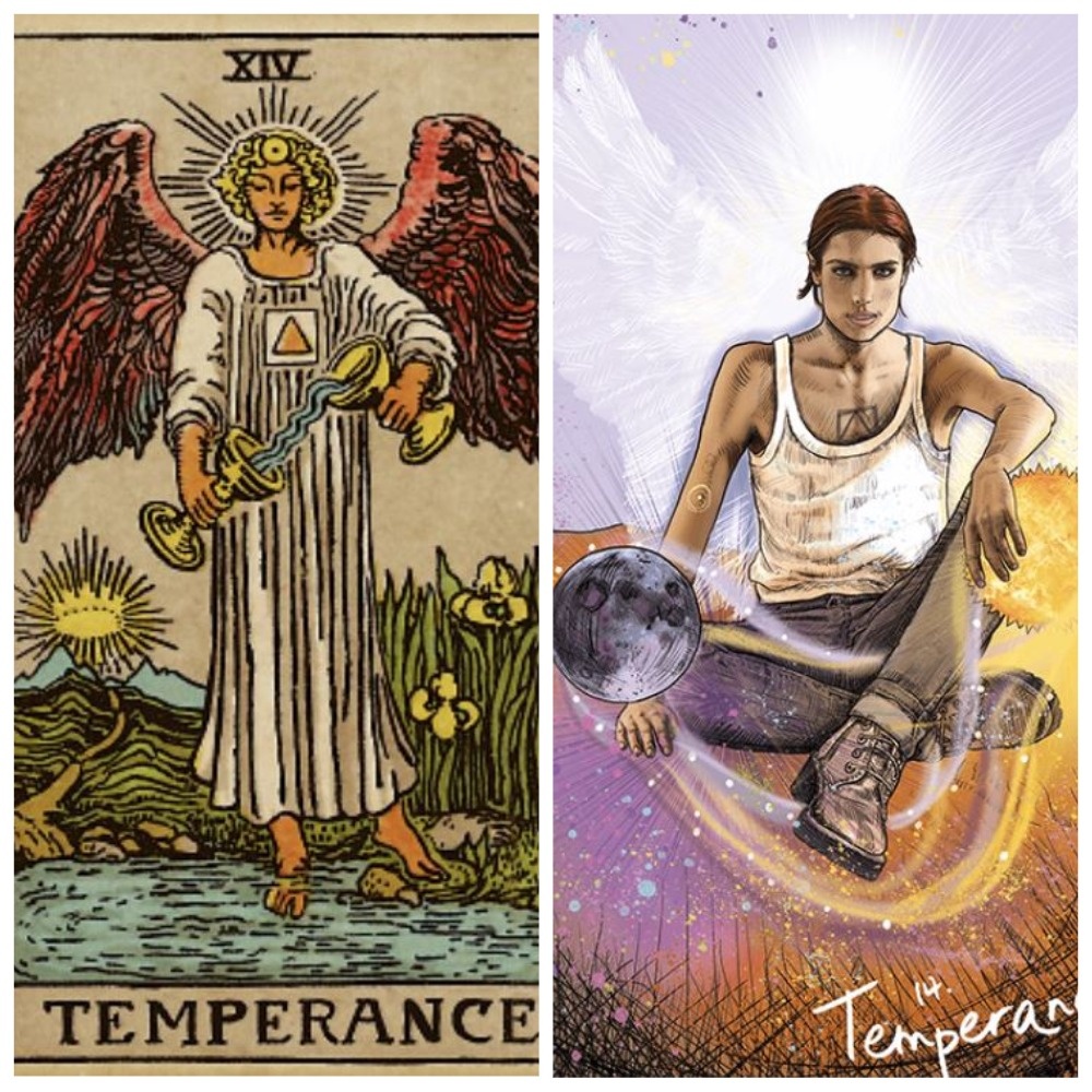 Символы Умеренности – крылатый ангел с двумя кубками, переливающими воду из одного в другой. Одна нога его стоит на земле, другая – в воде. За спиной – дорога, ведущая к горам и восходящему солнцу.
