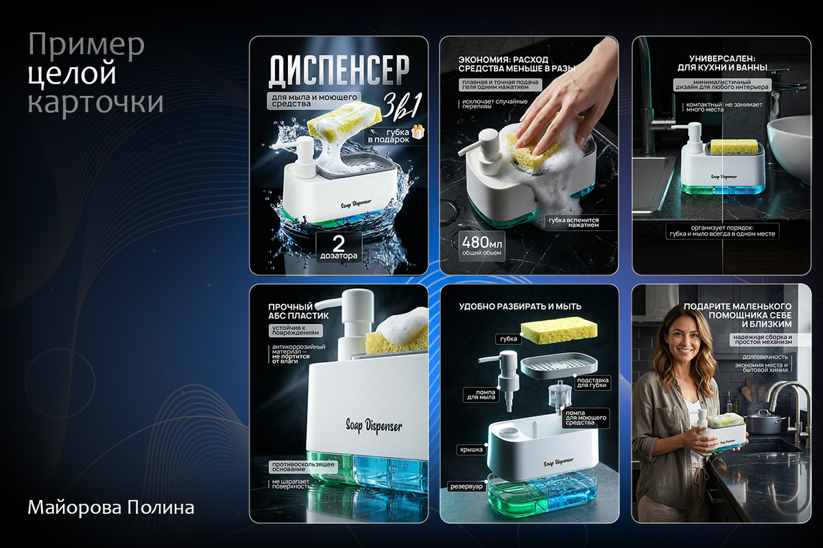 Делюсь свежим проектом! Задачей было упаковать привычный бытовой предмет так, чтобы он выглядел стильно, дорого и вызывал желание немедленно поставить его на свою кухню Атмосфера и визуал: Я решила уйти от стандартных «светлых» кухонных интерьеров и сделала ставку на глубокую, темную цветовую гамму. Черный фон с легким свечением создает премиальную атмосферу. На таком контрасте белоснежный матовый корпус диспенсера, сочная желтая губка и яркие жидкости в прозрачном резервуаре смотрятся максимально эффектно Детали: Каждый слайд логично ведет клиента от первого впечатления («вау-эффект» на обложке) до полного понимания продукта Нужен рабочий дизайн? Нажми на ссылку ниже, чтобы узнать подробности @designer_polinamayorova