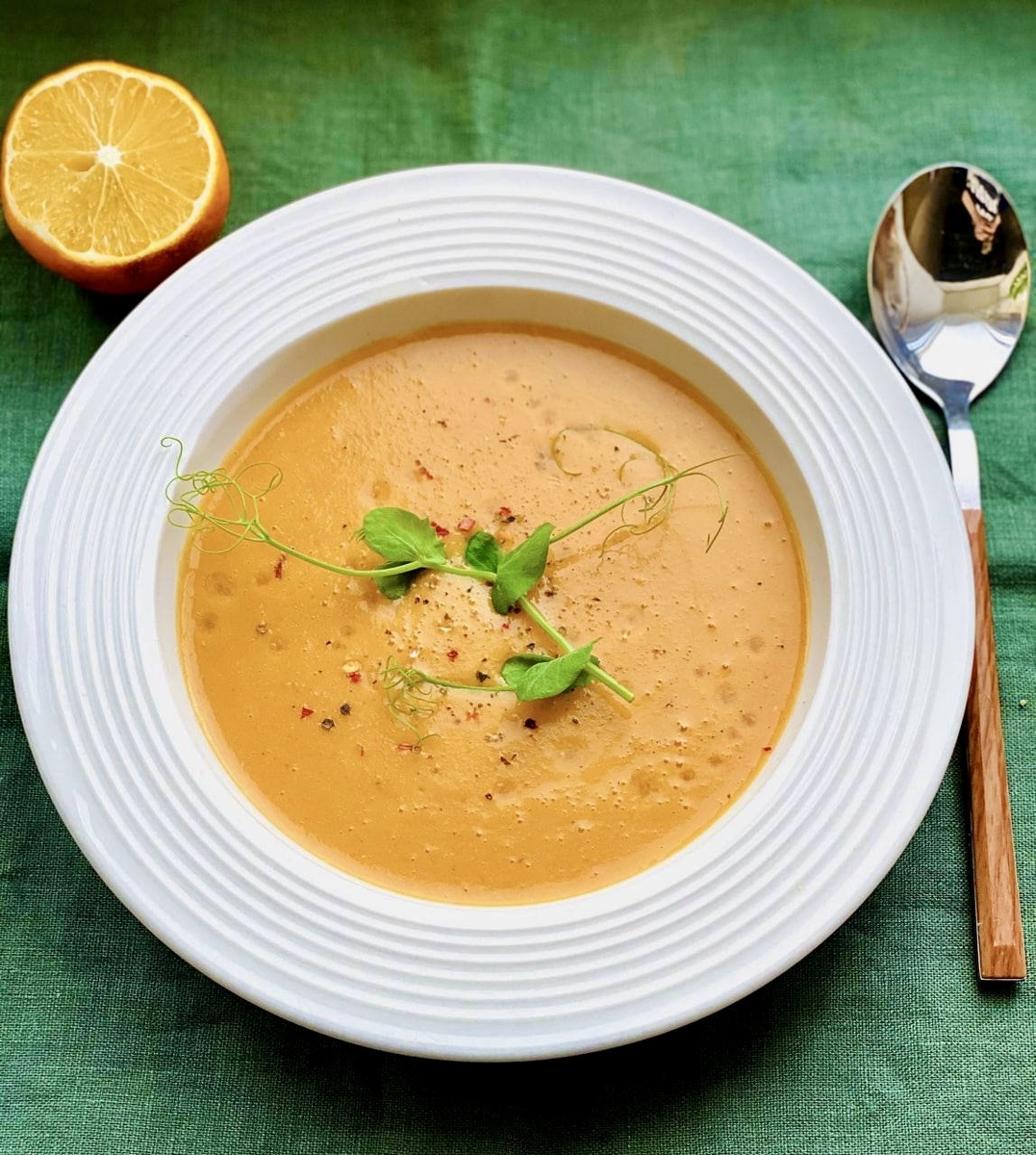 Ингредиенты: ▫️вода — 1 ⅖ л ▫️картофель — 2 шт. ▫️морковь — 1 шт. ▫️лук репчатый — 1 шт. ▫️чечевица — 250 г ▫️помидоры протертые пассата — 2 ст. л. ▫️растительное масло — 3 ст. л. ▫️соль — ½ ч. л. ▫️лимонный сок — ½ ч. л. Способ приготовления: 1. На растительном масле обжариваем нарезанный лук и натертую морковь. 2. К овощам добавить томатную пасту, картофель, нарезанный мелким кубиком, и промытую чечевицу. Тушим все вместе минут 15. 3. Заливаем овощи с крупой кипятком, солим, перчим и варим 25 мин. Затем пюрируем все блендером и подаем, добавив несколько капель лимона и черный перец. Приятного аппетита!