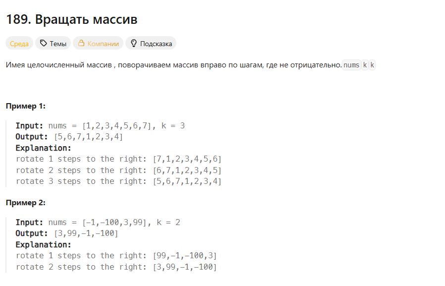 Всем привет, сегодня мы будем решать задачу на LeetCode. Нам нужно наш массив кое как преобразовать. Нужно сделать код, который будет двигать элементы массива вправо на k шагов, а когда они дойдут до конца, переносить их в начало массива. Вы можете посмотреть это на примере: