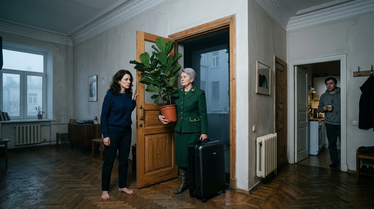 Галина Петровна возникла на пороге в 08:15. В руках она сжимала гигантский фикус, листья которого походили на восковые уши тропического чудовища. За её спиной возвышался чемодан из углепластика, по объему напоминающий небольшой сарай.