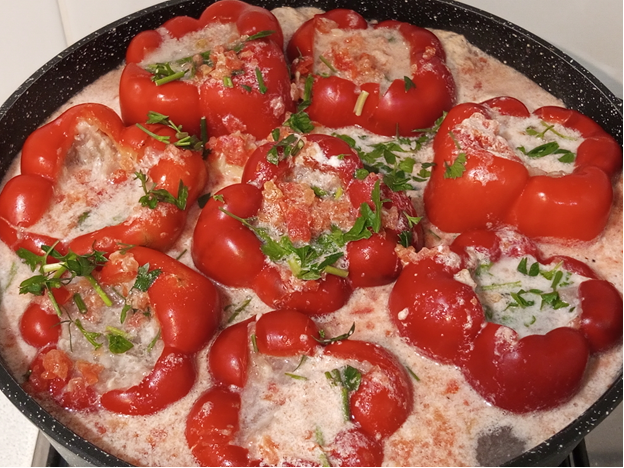 В моей семье все любят такие фаршированные перцы, очень быстро исчезающие, но даже не буду рассказывать, как это вкусно, просто поделюсь рецептом, а вы уж сами решите стоит готовить или нет. Ингредиенты на один килограмм фарша: - свежие сладкие перцы; - свиной фарш или смешанный – 1 кг.; - сухой рис – 200-250 гр.; - репчатый лук – 2 шт.; - сметана – 300 гр.; - вода – примерно 300 мл.; - соль – по вкусу; - перец черный молотый – по вкусу; - зелень петрушки – по вкусу. Фарш может быть свиной, куриный, смешанный из свинины с курицей или свинины с говядиной. Добавление риса в фарш по классике от 200 гр. до 250 гр. в зависимости от жирности фарша, желаемого количества риса в фарше, перцах, как и в голубцах. Обычно в жирный фарш добавляют 250 гр. риса, в фарш средней жирности 200 гр., а в нежирный куриный фарш 150 гр. риса. Яйцо в фарш для перцев, голубцов не добавляю, добавляю только в том случае если фарша получается больше чем перцев или листьев капусты, формирую фрикадельками. Мякоть мяс