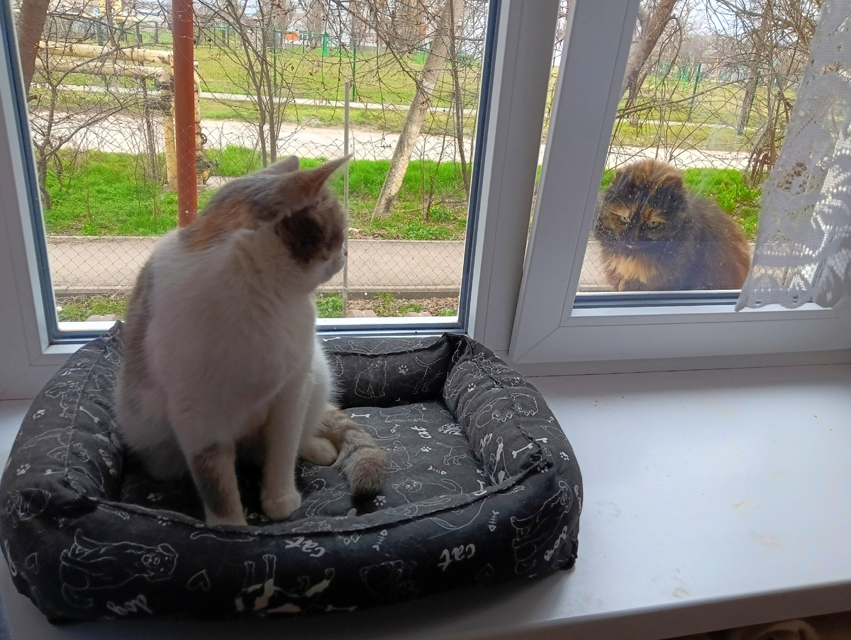 Утром слышу рычание Машеньки, подхожу и смотрю в окно, а там Манечка сидит на подоконнике с уличной стороны.