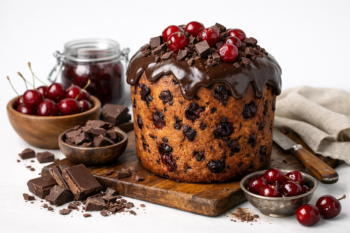 Если обычные куличи вам уже надоели, этот вариант может приятно удивить. Тесто получается тёмным, мягким, с глубоким шоколадным вкусом, а внутри попадаются кусочки шоколада и кисло-сладкая вишня. Разрез у такого кулича всегда очень красивый, и на столе он смотрится по-настоящему богато.