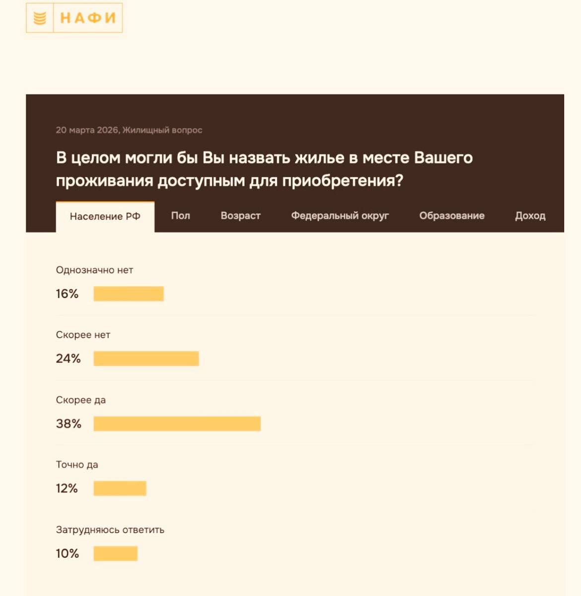 ? Казалось бы, страна одна, цены на квартиры тоже растут одинаково стремительно. Но опрос НАФИ показывает удивительную картину: мнения россиян о доступности жилья разделились ровно пополам. 40% считают, что купить квартиру в их городе невозможно. 50% уверены, что это вполне реально. Причем живут эти люди по соседству. Особенно драматичная ситуация в Центральном и Северо-Западном округах: там 45–47% жителей называют жилье недоступным. Но столько же их соседей с этим не согласны. Главный парадокс скрывается в цифрах по возрастам. Самые уверенные в доступности — молодежь 25–34 лет, 56% из них говорят «да, мы можем купить жилье». В то время как люди старшего возраста смотрят на рынок с гораздо большим пессимизмом. Еще один неожиданный момент: чаще всего верят в свои силы люди со средним и средним профессиональным образованием — 52% и 55% соответственно. Видимо, они либо живут в регионах с более доступными ценами, либо уже имеют за спиной приватизированное жилье или дом с участком. А