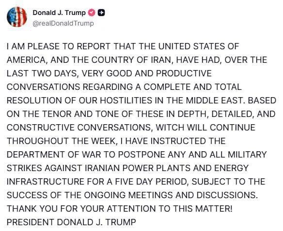 Трамп заявил, что США прекращают удары по Ирану на 5 дней после «удачных» переговоров. Я рад сообщить, что за последние 2 дня между США и Ираном прошли очень удачные переговоры. Я дал распоряжение отложить все военные удары на 5 дней», — сообщил президент США.