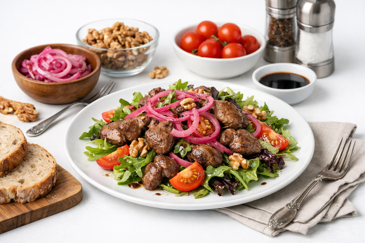 Этот салат я готовлю, когда хочется чего-то сытного, но не тяжёлого. Куриная печень получается нежной, лук даёт правильную кислинку, а тёплая подача делает вкус особенно уютным. Рецепт простой, а на вид салат получается таким, будто его подали в хорошем кафе.