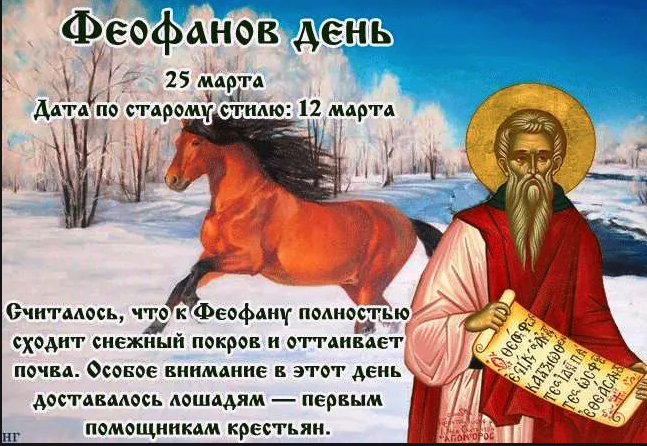 Феофанов день, отмечаемый 25 марта, сочетает православную традицию с народными поверьями о пробуждении природы. Этот день посвящен памяти преподобного Феофана Исповедника и служит символом перехода от зимы к весне. Феофанов день связан с житием преподобного Феофана Исповедника, византийского монаха VIII–IX веков, стойко защищавшего иконопочитание во времена гонений. В православии 25 марта верующие посещают храмы, зажигают свечи и молятся о здоровье, защите от сглаза и мудрости в воспитании детей. В народном календаре этот день знаменует окончание зимы: снег таял, земля освобождалась для работ. Крестьяне готовились к посеву, обихаживая лошадей — главных помощников в поле. Традиции сохранились в славянских регионах, включая Россию, где праздник ассоциировался с урожаем льна, конопли и ржи. В 2025 году, 25 марта (вторник), день усиливает актуальность: ранняя весна побуждает к сельскохозяйственным ритуалам. Современные горожане используют его для уборки и семейных обрядов, сохраняя связь