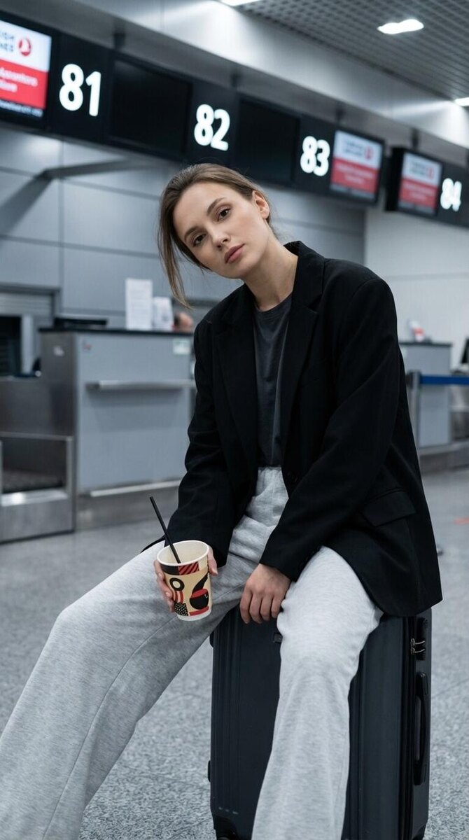 Модель: Nano Banana Сгенерировать🪄 Используй лицо женщины с загруженного фото. Женщина сидит на чемодане в зоне регистрации аэропорта. Корпус слегка развернут влево относительно камеры, одна нога расслабленно вытянута вперед. В руке — бумажный стаканчик с напитком и трубочкой. Голова чуть наклонена, взгляд направлен прямо в камеру. Кадр средний, примерно от колен до головы, композиция центрирована на фигуре. Ровный матовый тон кожи, естественный вид, мягко подсвеченный искусственным освещением терминала. Макияж легкий, минималистичный: мягкие бежево-коричневые тени, тонкая черная подводка, глубокие черные ресницы, приглушенная натуральная розовая помада. Волосы распущены. На женщине свободный объемный черный жакет с матовой текстурой, под ним — темно-серая футболка. Широкие брюки из мягкого светло-серого материала. Чемодан темно-графитового цвета с легкой текстурой. В руке — теплый бежевый бумажный стаканчик с графичным узором в черных, красных и кремово-белых тонах. Трубочка матовая