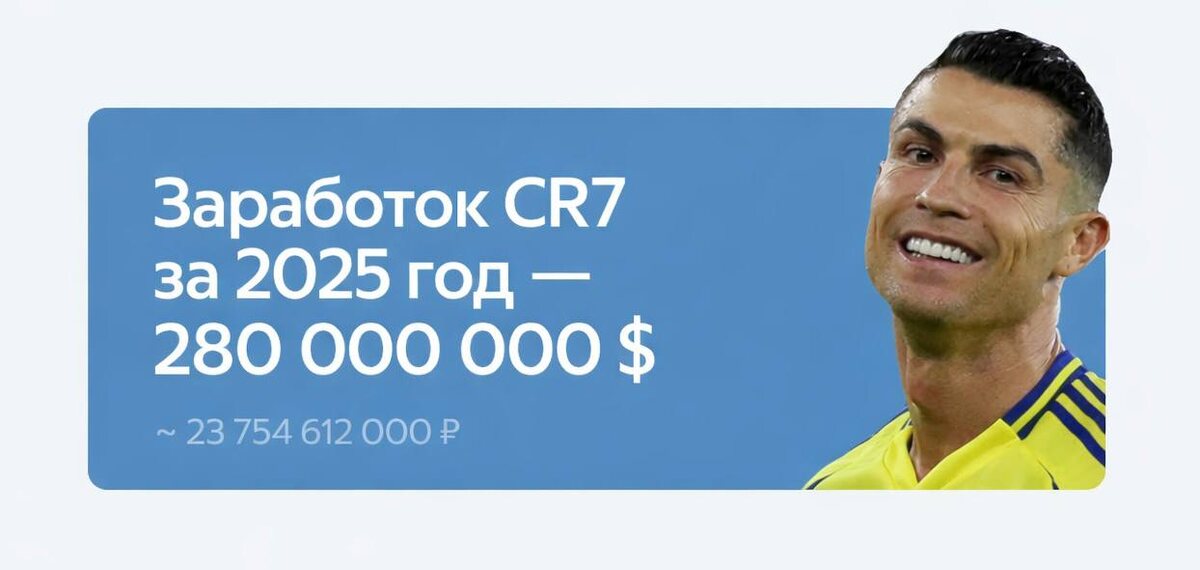 230 млн $ заработал Криштиану Роналду за 2025 год, выступая за команду Аль-Наср. Ещё 50 млн принесли ему различные коммерческие сделки.