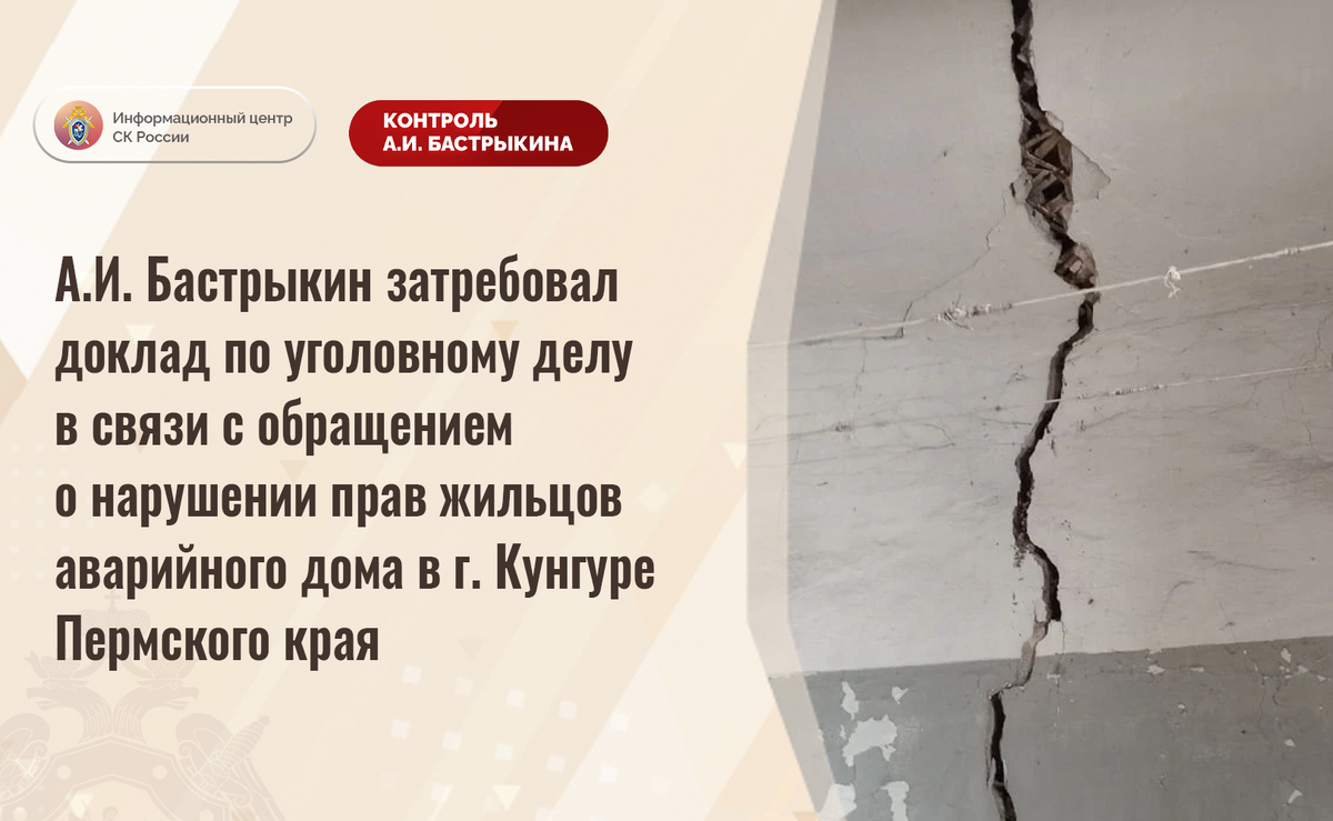А.И. Бастрыкин затребовал доклад по уголовному делу в связи с обращением о нарушении прав жильцов аварийного дома в г. Кунгуре Пермского края В комментариях в аккаунте приёмной Председателя СК России А.И. Бастрыкина в социальной сети «ВКонтакте» размещено обращение по вопросу длительного нерасселения жильцов общежития на улице Бачурина в городе Кунгуре Пермского края. Перекрытия и лестничные марши здания 1954 года постройки разрушаются, в стенах образовались трещины, протекает кровля. В связи с высокой степенью физического износа конструкций в 2021 году строение признано аварийным, однако до настоящего времени благоустроенное жилье гражданам не предоставлено. Обращения в компетентные органы результатов не принесли. В СУ СК России по Пермскому краю возбуждено уголовное дело. Председатель Следственного комитета Российской Федерации Александр Иванович Бастрыкин затребовал у руководителя СУ СК России по Пермскому краю Дениса Валерьевича Головкина доклад о ходе и результатах расследования