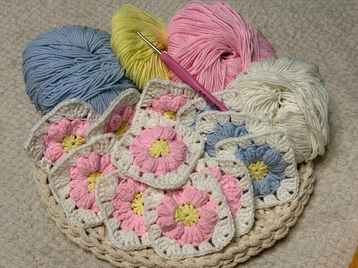 Связала еще 6 квадратов🩷 с розовым цветом все. Теперь нужно еще 6 голубых цветов и можно будет соединять квадраты.