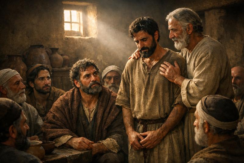 Савл вернулся в Иерусалим. Город, где он когда-то учился у Гамалиила, где стоял у одежд побивавших Стефана, где дышал ненавистью и угрозами. Все помнили его: как он врывался в дома, как тащил людей в темницы, как способствовал убийству Стефана. И вот этот человек утверждает, что стал своим? «Это ловушка, — шептали ученики. — Он пришёл арестовать нас». Никто не верил, никто не принимал его. Он молился: «Господи, что мне делать? Я никому не нужен. Меня все боятся». И тогда Бог ответил — не видением, не голосом, а человеком. Это был Варнава, прозванный «сыном утешения». Левит с Кипра, который продал поле и деньги принёс апостолам. Человек, который никого не боялся, потому что любил всех. Варнава нашёл Савла, взял за руку и привёл к апостолам. «Не бойтесь, — сказал он. — Этот человек действительно видел Господа на дороге». Он рассказал, как Савл ослеп и прозрел, как бежал в корзине, как спорил с иудеями, что Иисус — Христос. Апостолы слушали. Пётр подошёл к Савлу, заглянул в глаза. В них