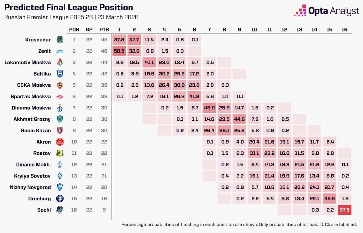 Искусственный интеллект Opta оценил шансы красно-белых выиграть титул в этом сезоне. Они являются лишь математическими: вероятность составляет 0,1%. По мнению компьютера, москвичи сохранят текущее шестое место. Наиболее вероятным кандидатом на чемпионство является «Зенит»: на его победу даётся 56,5%. Успех действующего чемпиона «Краснодара» оценивается в 37,8% — более вероятным исходом для «быков» ИИ считает второе место. Что же касается третьего места, прогноз даётся в пользу «Локомотива» — 41,1%. @russian_rt_sport