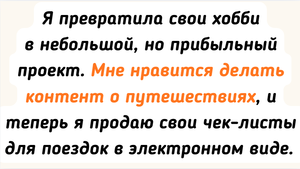 - Я превратила свои хобби в небольшой, но прибыльный проект. Мне нравится делать контент о путешествиях, и теперь я продаю свои чек-листы для поездок в электронном виде. Создаю простые лендинги и настраиваю автоматическую рассылку, так что после запуска процесс идет практически без моего участия. Мне остается только заниматься контентом и привлекать людей на свою страницу.