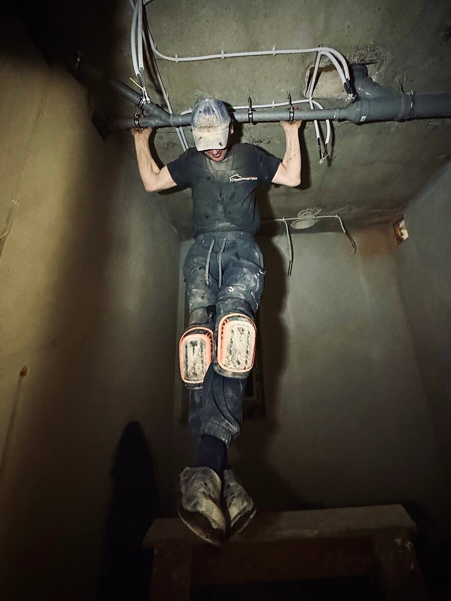 Монтаж должен быть надежным. На фото проверка креплений канализационной трубы. Специфическая, но эффективная. А главное, что проверяет тот, кто делал. И это вы еще не видели как мы напряжение в розетках проверяем.