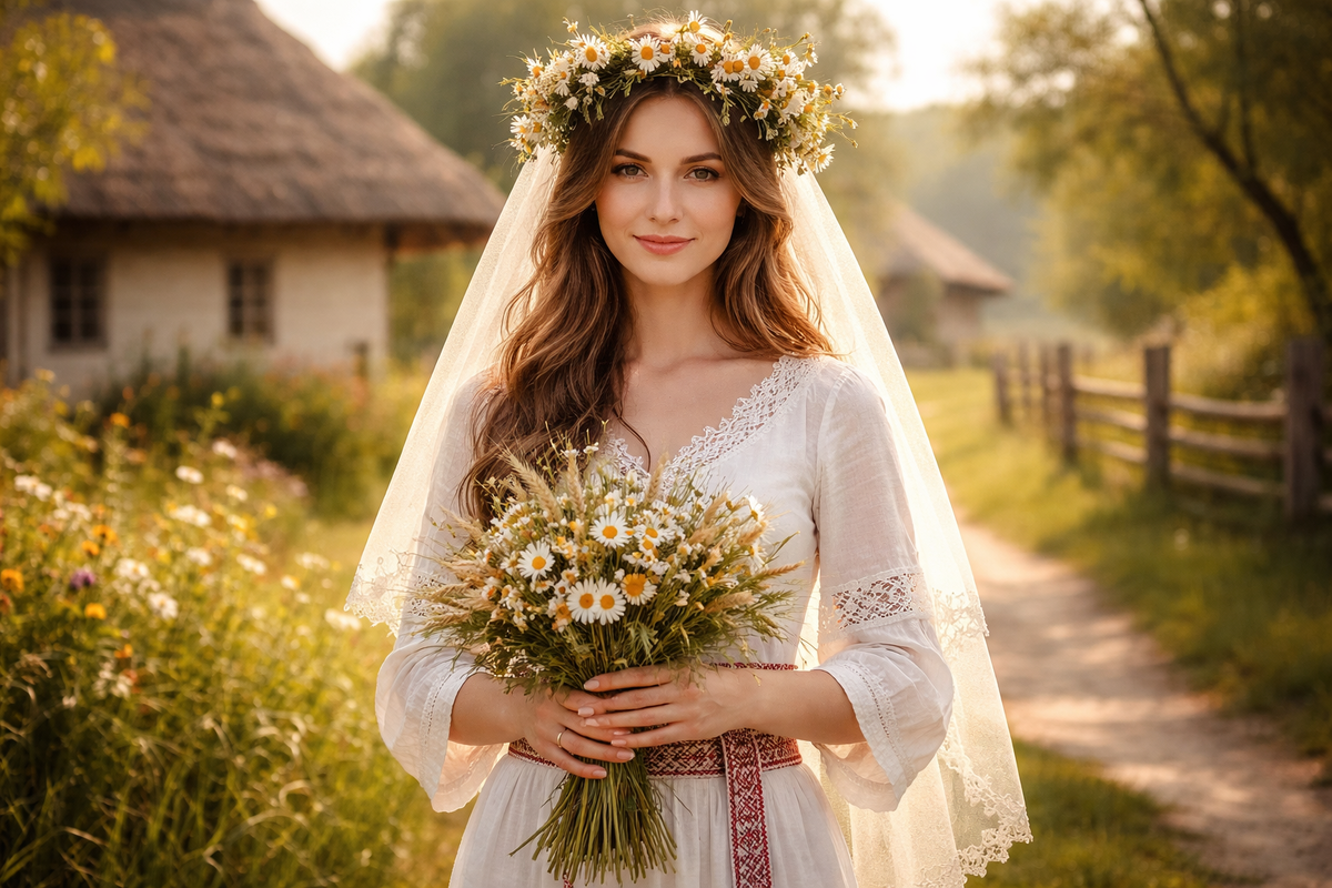 Утром она оделась спокойно. Даже медленно. Заколола волосы, разгладила фату, провела ладонью по тонкой ткани. Полынь всё ещё была на шве. Маленькая сухая веточка. Будто кто-то из хутора положил ей в руку не украшение, а напоминание.