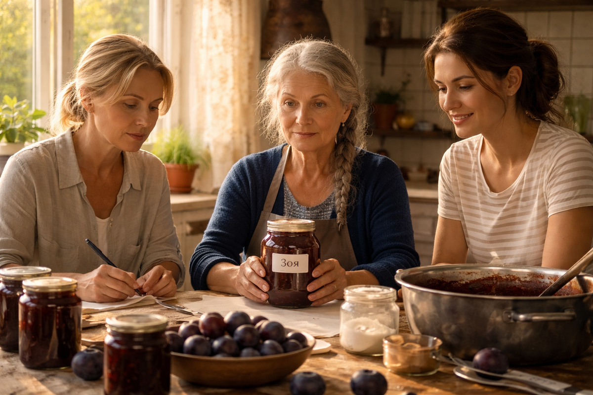 Слива в саду ещё держалась. Часть плодов уже помялась в траве, часть только-только дозрела. Яна вынесла таз, Раиса села у окна на низкий стул, а Лидия закатала рукава рубашки и поставила на плиту широкий медный таз, которым семья пользовалась столько лет, что его дно светилось изнутри тёмным золотом. Вода зашумела. Крышки легли рядком на полотенце. Нож пошёл по сливе чисто, с тихим влажным хрустом.