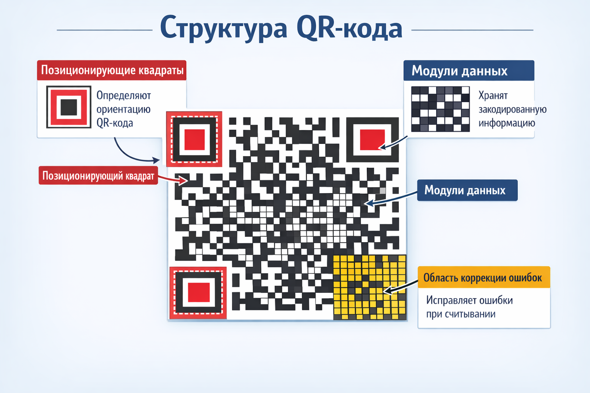 Три больших квадрата по углам — это не декоративный элемент, а критически важная часть системы. Они помогают сканеру определить: Представьте это как угловые флаги на спортивном поле — они чётко обозначают границы и направление игры. Без этих «якорей» сканер просто не поймёт, где искать информацию. Модули данных — язык двоичного кода