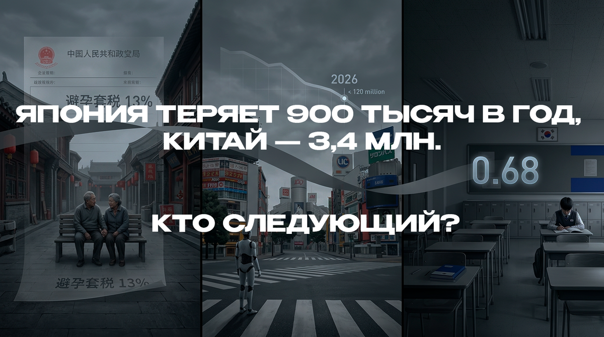 В январе 2026 года Китай объявил шокирующие цифры: население страны сократилось на 3,39 миллиона человек за год. Рождаемость упала до 0,98 ребёнка на женщину — впервые в истории ниже единицы . В Южной Корее тем временем коэффициент рождаемости обновил мировой антирекорд, опустившись до 0,68 . А Япония, теряющая почти 900 тысяч человек ежегодно, готовится к тому, что её население впервые за историю наблюдений упадёт ниже 120 миллионов .
