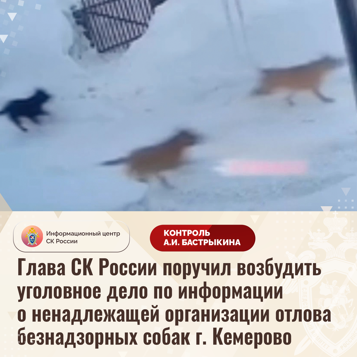 Глава СК России поручил возбудить уголовное дело по информации о ненадлежащей организации отлова безнадзорных собак в г. Кемерово В социальной сети сообщается, что на протяжении длительного времени во дворе одного из многоквартирных домов на территории Рудничного района города Кемерово обитает стая агрессивных собак, которые нападают на других животных. Местные жители опасаются за жизнь и здоровье детей, однако мер к отлову не принимается. В СУ СК России по Кемеровской области - Кузбассу организована процессуальная проверка. Председатель Следственного комитета Российской Федерации Александр Иванович Бастрыкин поручил и.о. руководителя СУ СК России по Кемеровской области – Кузбассу Алексею Анатольевичу Ткачу возбудить уголовное дело и доложить о ходе и результатах его расследования. Исполнение поручения поставлено на контроль в центральном аппарате ведомства. #СледственныйКомитет #СКРоссии #СК #ИЦСКР #ИнформационныйЦентр #АлександрБастрыкин #ПредседательСКР #КонтрольПредседателяСКР #Ко