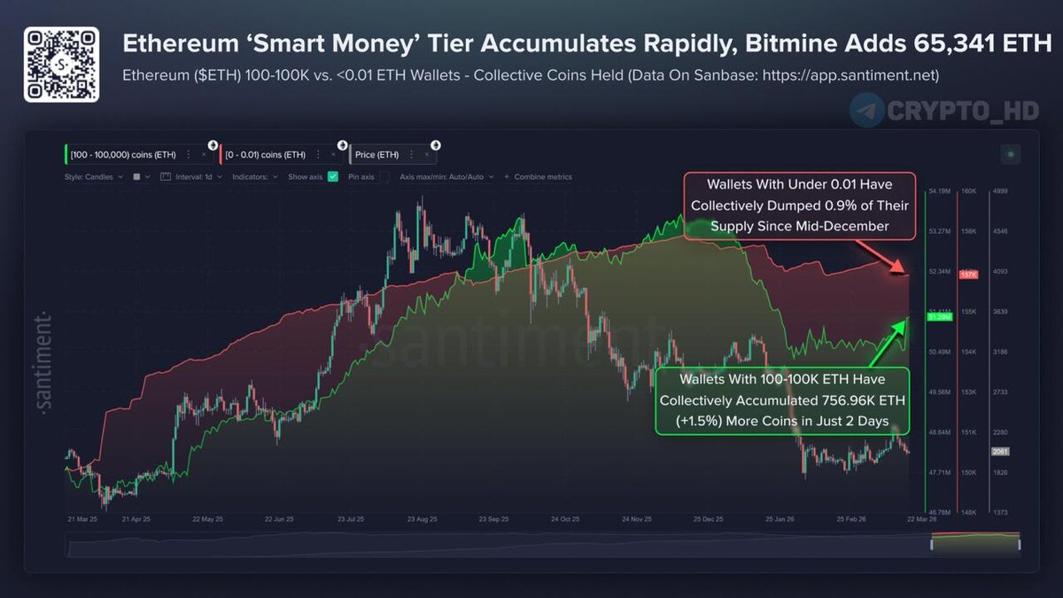 🐋 Santiment: Киты накопили 756,960 ETH ($1,6b) за последние 2 дня – речь о кошельках с балансом 100-100,000 ETH.