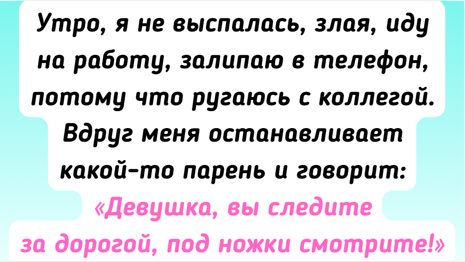 - Утро, я не выспалась, злая, иду на работу, залипаю в телефон, потому что ругаюсь с коллегой. Вдруг меня останавливает какой-то парень и говорит: «Девушка, вы следите за дорогой, под ножки смотрите!» Я не оценила его старания, ответила в грубой форме: «Не ваше дело!» Прошла пару метров, поскользнулась на льду и упала прямо на пятую точку. Сижу на земле, больно, еще больше злюсь, но тут возвращается этот парень, помогает мне подняться и добавляет: «А я ведь предупреждал...» Идем с ним пить кофе на днях, добрее человека, кажется, не существует на этой планете.