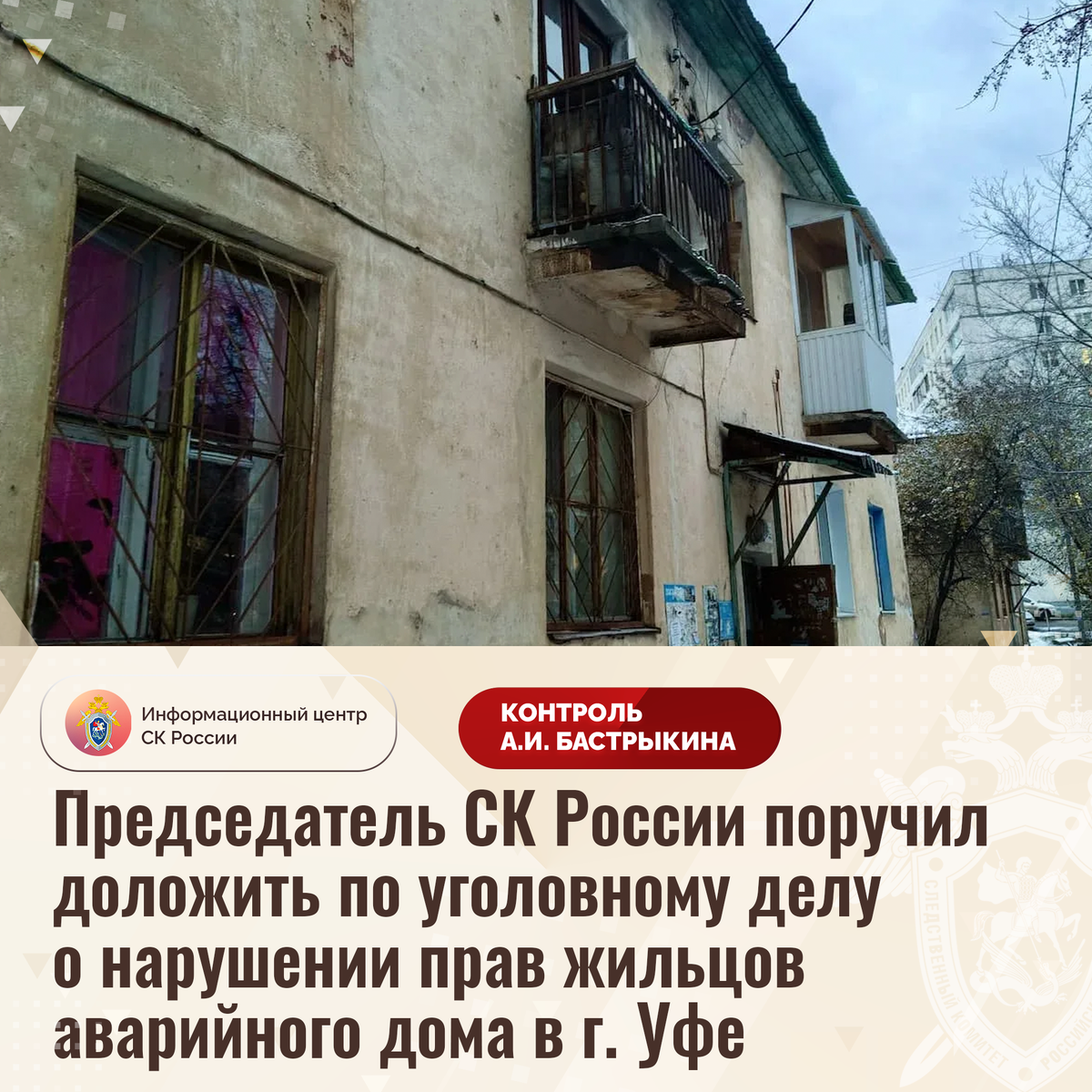 Председатель СК России поручил доложить по уголовному делу о нарушении прав жильцов аварийного дома в г. Уфе В СМИ и социальной сети сообщается о длительном нерасселении жильцов многоквартирного дома на улице Черниковской города Уфы. Здание 1941 года постройки находится в непригодном состоянии: кровля разрушается, что приводит к образованию сырости. В 2021 году строение признано аварийным, однако до настоящего времени граждане не расселены. В СУ СК России по Республике Башкортостан возбуждено уголовное дело. Председатель Следственного комитета Российской Федерации Александр Иванович Бастрыкин поручил руководителю СУ СК России по Республике Башкортостан Владимиру Владимировичу Архангельскому доложить о ходе и результатах расследования уголовного дела. Исполнение поручения поставлено на контроль в центральном аппарате ведомства. #СледственныйКомитет #СКРоссии #СК #ИЦСКР #ИнформационныйЦентр #АлександрБастрыкин #ПредседательСКР #КонтрольПредседателяСКР #КомментарийКонтроль #Башкортостан