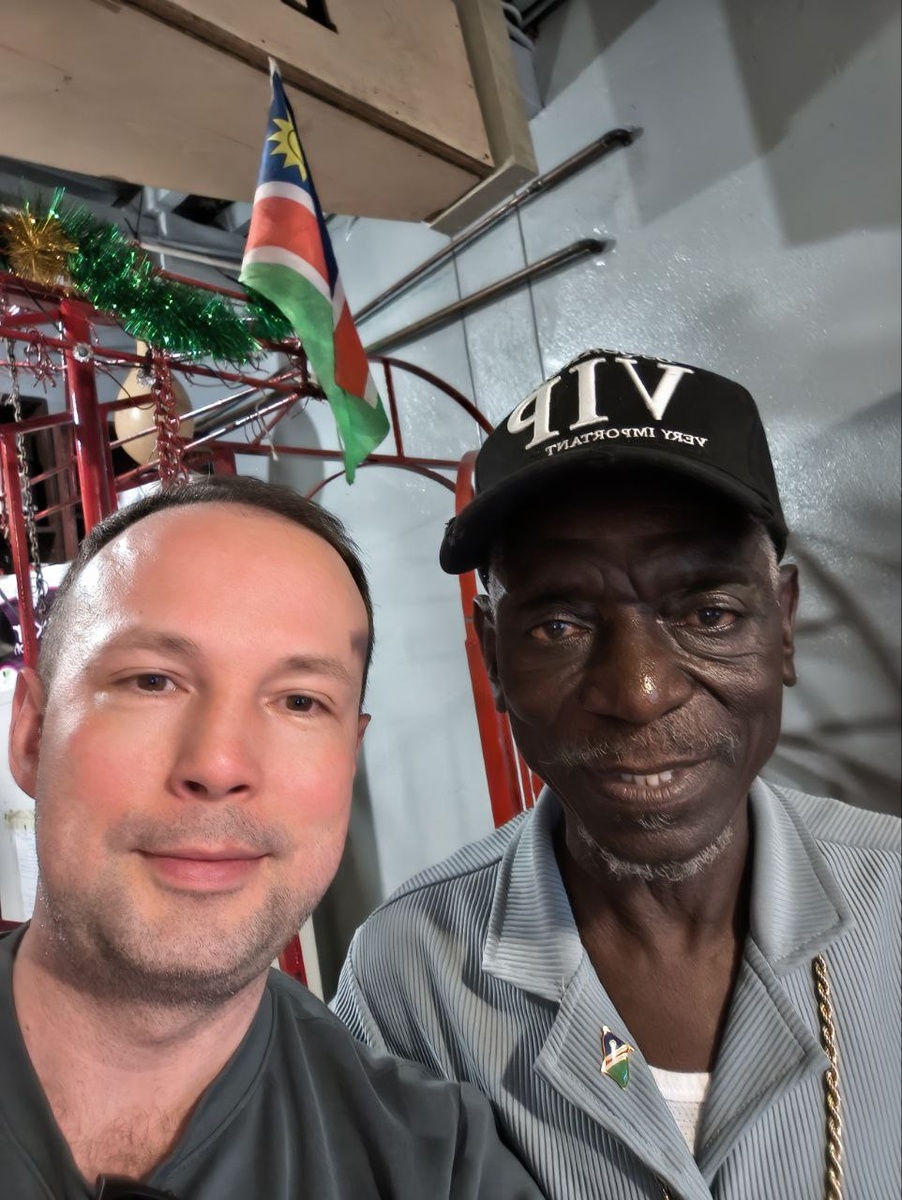 Как зовут - толком неизвестно. Но все знают его как Warem Water (в переводе с африкаанс - тёплая вода). Это персональное прозвище, которое стало его новым именем, было дано ему полевыми командирами армии ЮАР в период гражданской войны в Анголе и борьбы Намибии за независимость с ЮАР. Немногие намибийцы были удостоены чести получить от тогдашнего врага персональное прозвище. Но у него получилось. Варэм Ватэр - один из немногих в силу возраста живущих и пользующихся огромным уважением соплеменников бойцов ПЛАНа (People's Liberation Army of Namibia - PLAN), боевого или с точки зрения тогдашних властей ЮАР - террористического крыла партии СВАПО. Варэм Ватэр в конце 70-х три года обучался навыкам диверсионной деятельности и ведения партизанской войны в СССР и Югославии, а потом вместе с другими выпускниками был заброшен в Анголу, повоевал там, а оттуда вместе с такими же комрадами проник в Намибию, продолжив вооружённое сопротивление, приближая тем самым независимость своего края. Несмот