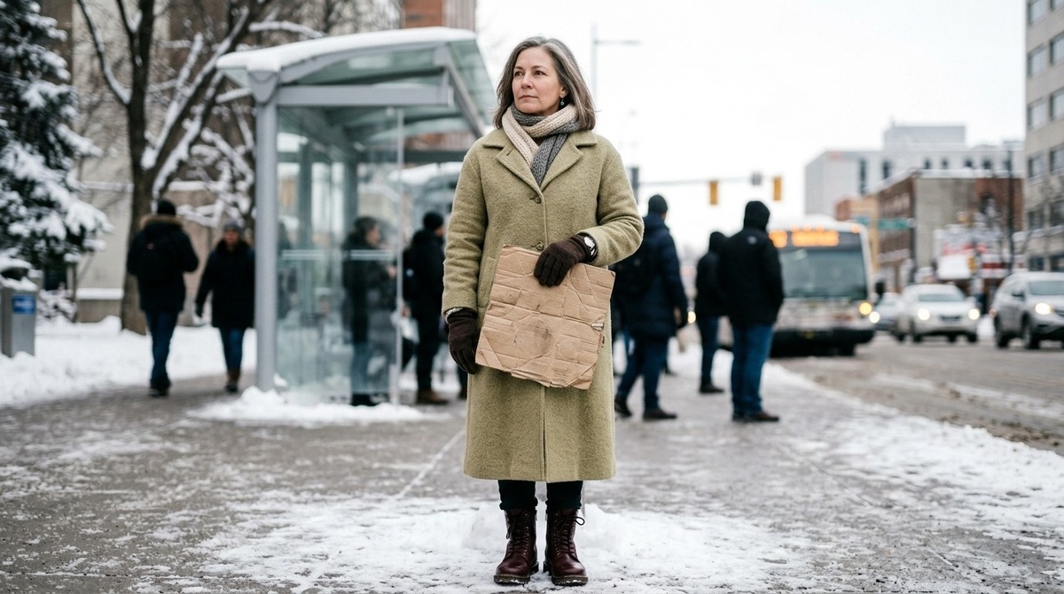 У остановки было пусто. Только урна, металлическая скамейка и следы на рыхлом снегу. Из кармана пальто она достала смятую картонку, ту самую, которая столько недель спасала левую ступню от ледяной воды. Подержала в ладони, глядя на нее так, будто вспоминала не вещь, а чужую привычку жить обносками даже там, где давно пора было выбрать целое.