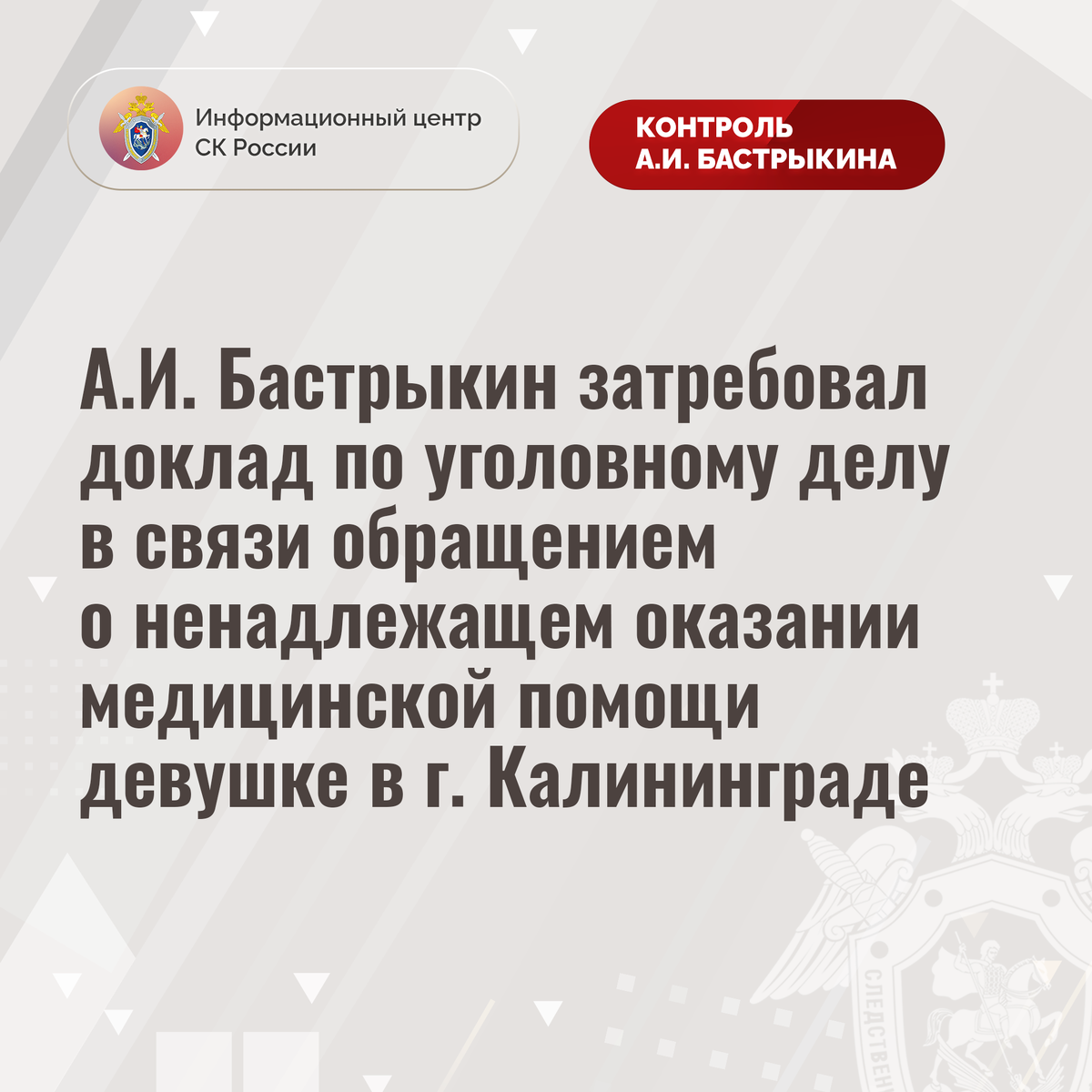 А.И. Бастрыкин затребовал доклад по уголовному делу в связи обращением о ненадлежащем оказании медицинской помощи девушке в г. Калининграде
