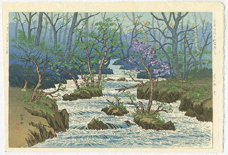 Голоса соловьев Повсюду сочатся сквозь дымку… Такая стоит тишина. Не часто встретишь людей Весною в горном селенье. Сайге; Горная хижина; Перевод с японского языка выполнен В. Н. Марковой. Гравюра: Такахаси Хэнми; "Весна в Ойрасэ"; 1949 г. #大和の歌