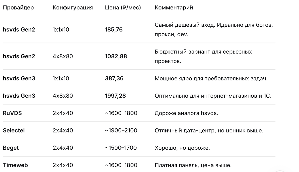 Итог: на конфигурации 4x8x80 разница с конкурентами достигает 1000–1500 ₽ в месяц. За год — до 18 000 ₽ экономии.