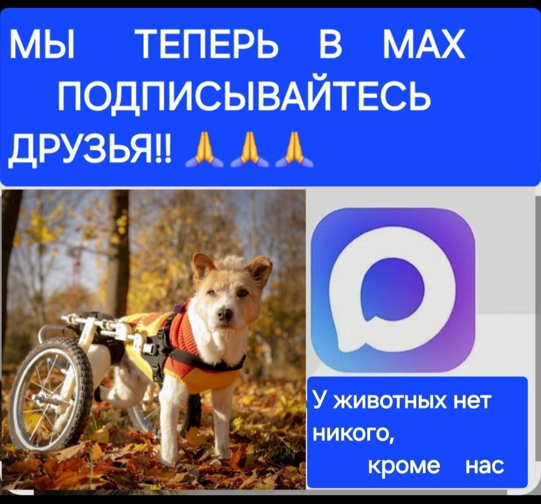 Дорогие друзья, к большому сожалению, телеграмм перестает работать . Потерять Вас, для животных большая беда. Потому что только благодаря Вам мы спасаем души. Вы единственная надежда для тех кто сейчас попал в большую беду. Если вдруг у Вас есть платформа ,,Макс,, и Вам так удобнее нас видеть подпишитесь пожалуйста на наш канал: https://max.ru/join/JoEmXy3_iqLIK4f5sbxU34fpFUy0ncS7HEG1xD2on-0 .