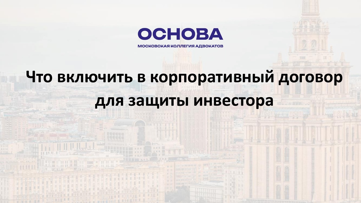 На практике именно качественная проработка корпоративного договора определяет, сможет ли инвестор влиять на бизнес, защитит ли он свою долю, а также сможет ли вернуть инвестиции и выйти из проекта без потерь.