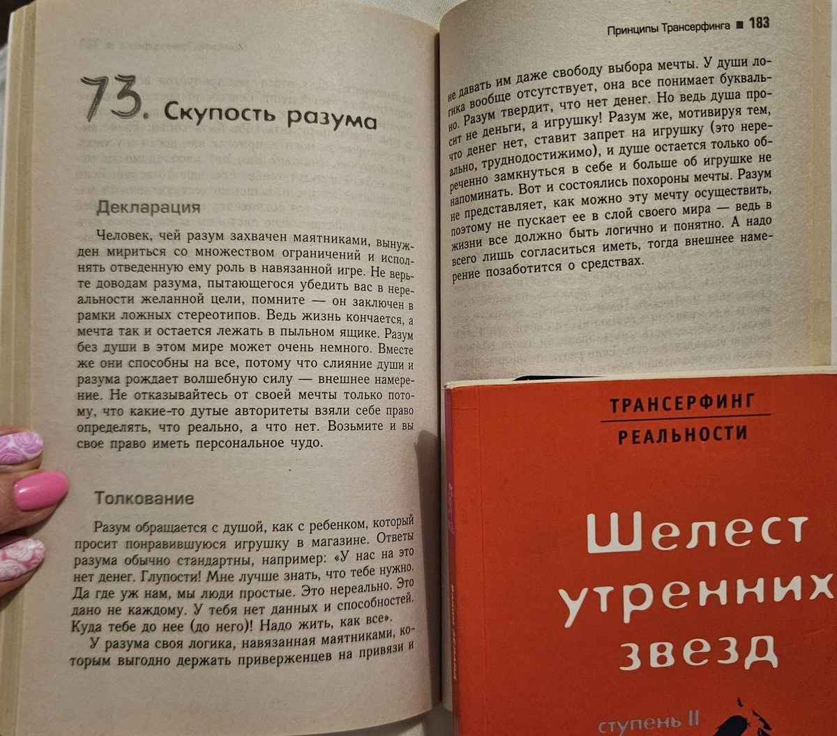 73/78 Практикум управления реальностью - Трансерфинг Скупость разума "Не верьте доводам разума, пытающегося убедить вас в нереальности желанной цели, помните - он заключен в рамки ложных стереотипов. Ведь жизнь кончается, а мечта так и останется лежать в пыльном ящике. Разум без души в этом мире может очень немного. Вместе они способны на все, потому что слияние души и разума рождает волшебную силу - внешнее намерение. Не отказывайтесь от своей мечты, только потому, что какие-то дутые авторитеты взяли себе право определять, что реально, а что нет. Возьмите и вы свое право иметь персональное чудо." "Разум не представляет, как можно эту мечту осуществить, поэтому не пускает ее в свой своего мира - ведь в жизни все должно быть логично и понятно. А надо всего лишь согласиться иметь, тогда внешнее намерение позаботится о средствах." ❣А чей голос в вашей голове говорит, что "это не возможно, не реально, не получится, оно того не стоит" и т.п.? Если ваш, то сколько вам там лет - почему в