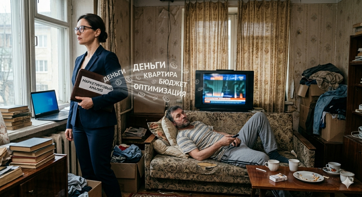 Важное уточнение: Мужчина в 58 лет с «убитой» квартирой и без работы — это человек, который в случае развода будет биться за каждую вилку. Он понимает, что без Елены он — никто. Именно поэтому он так агрессивен,когда она поднимает разговор о его полезности: страх потерять «кормушку» порождает ярость.