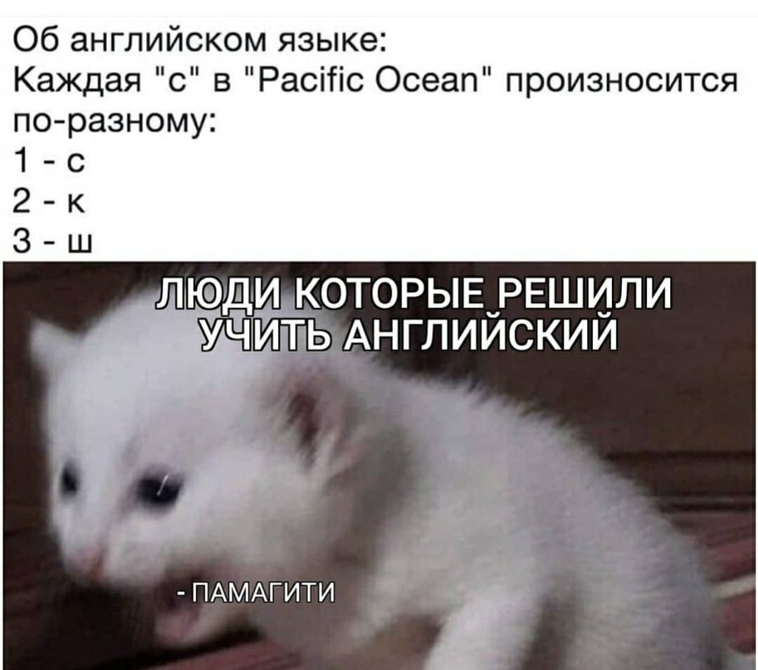 ? 🇬🇧 Кроме английского, я ещё учила испанский и французский. Последние два в сознательном возрасте и после английского. Первое, что меня удивило, — нет постоянной записи транскрипции. Даже в красивых тематических словариках этой графы в середине не было. 📚 Дело в том, что во многих языках есть свои чёткие правила произношения. Ты всегда понимаешь, как правильно прочитать это слово. ➡️ Но вот в английском это не работает. Надо оочень хорошо насмотреться, чтобы понимать, как и что произносится. И то это не логика, а скорее та самая "чуйка". И тут мне попался этот мем, который всё и объяснит на пальцах. 🌊 Pacific пришло в английский из французского "pacifique", да и латинский"pax" (мир) тут видно невооружённым взглядом. Дело в том, что во французском "с" перед "у/e/i" читается как "c", а вот в этом сочетании "que" она работает как "к". С океаном история тоже сложная: тут вмешалась во все дела йотовая палатализация, которая превратила "си" в "ш", но произошло это в английском со