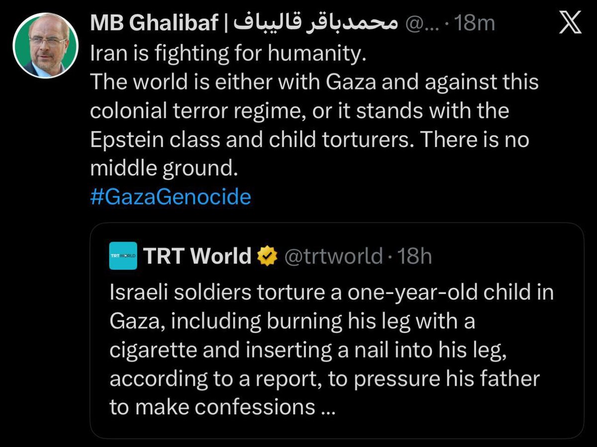 ‘Iran fighting for humanity… world either with Gaza or with Epstein class’ — parliament speaker
