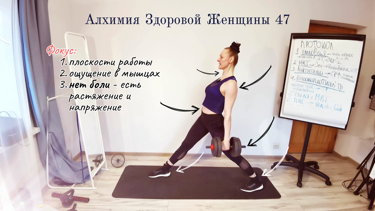 Вы работаете с «острым углом» в выпадах, учитесь чувствовать ахиллы, заднюю поверхность бедра и включать пресс в каждую секунду работы. Ваш пресс защищает поясницу. А в 45+ проблемы с позвоночником уже есть у всех. Вы делаете упражнения, прогрессируя и физически и с пониманием, какие мышцы у вас больше зажаты, что будете развивать в следующий раз. Вы не идете через боль, через давление, но и не зависаете в жалости и слабости отдачи. У вас не получится. я разъясняю упражнения так детально, что вы пробуете и проходите то, что считали невозможным.