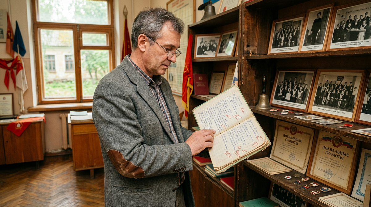 Я начал в тот же день. После уроков, в пустом музее. Комната — двадцать квадратов, три стеллажа, два шкафа, витрина. На стенах — фотографии выпусков с семидесятого года. Чёрно-белые, потом цветные, потом — снова блёклые, девяностые. Грамоты в рамках. Вырезки из районной газеты. Письма.