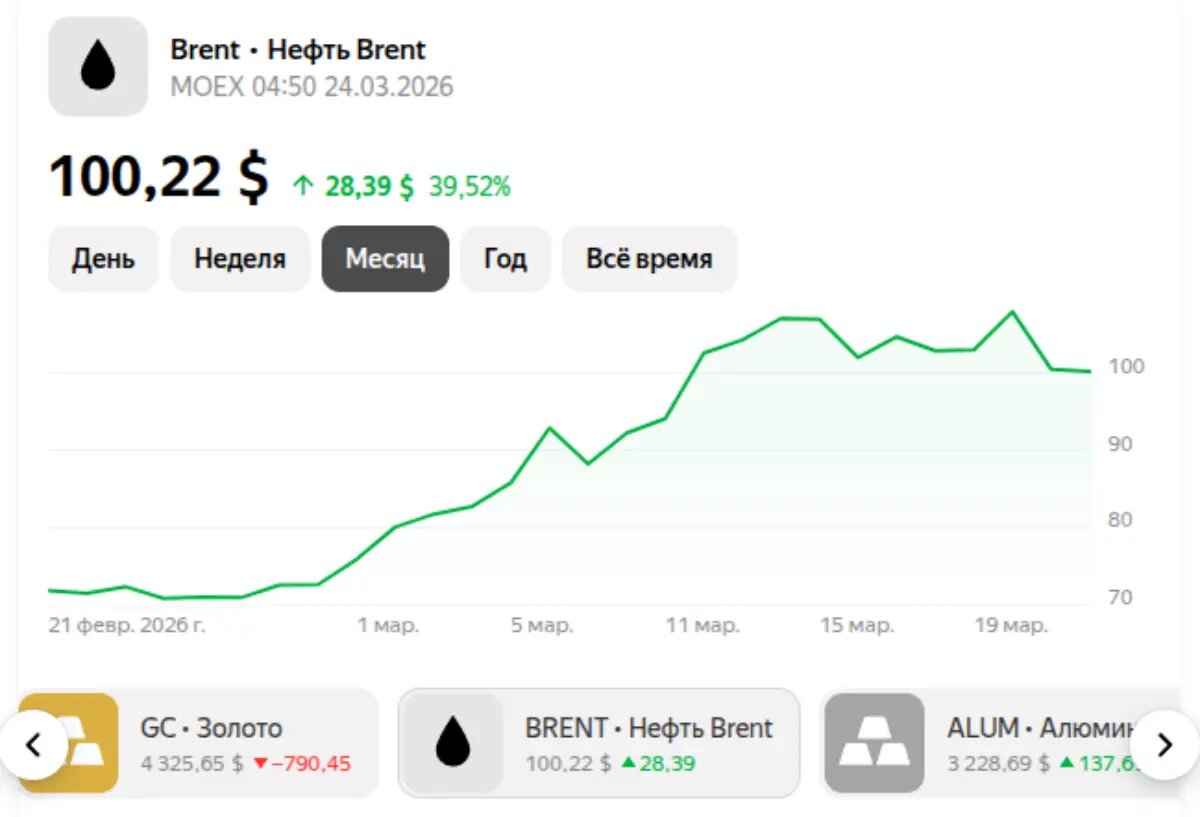 Цена нефти Brent 24 марта 2026 года снизилась до 100,22 доллара