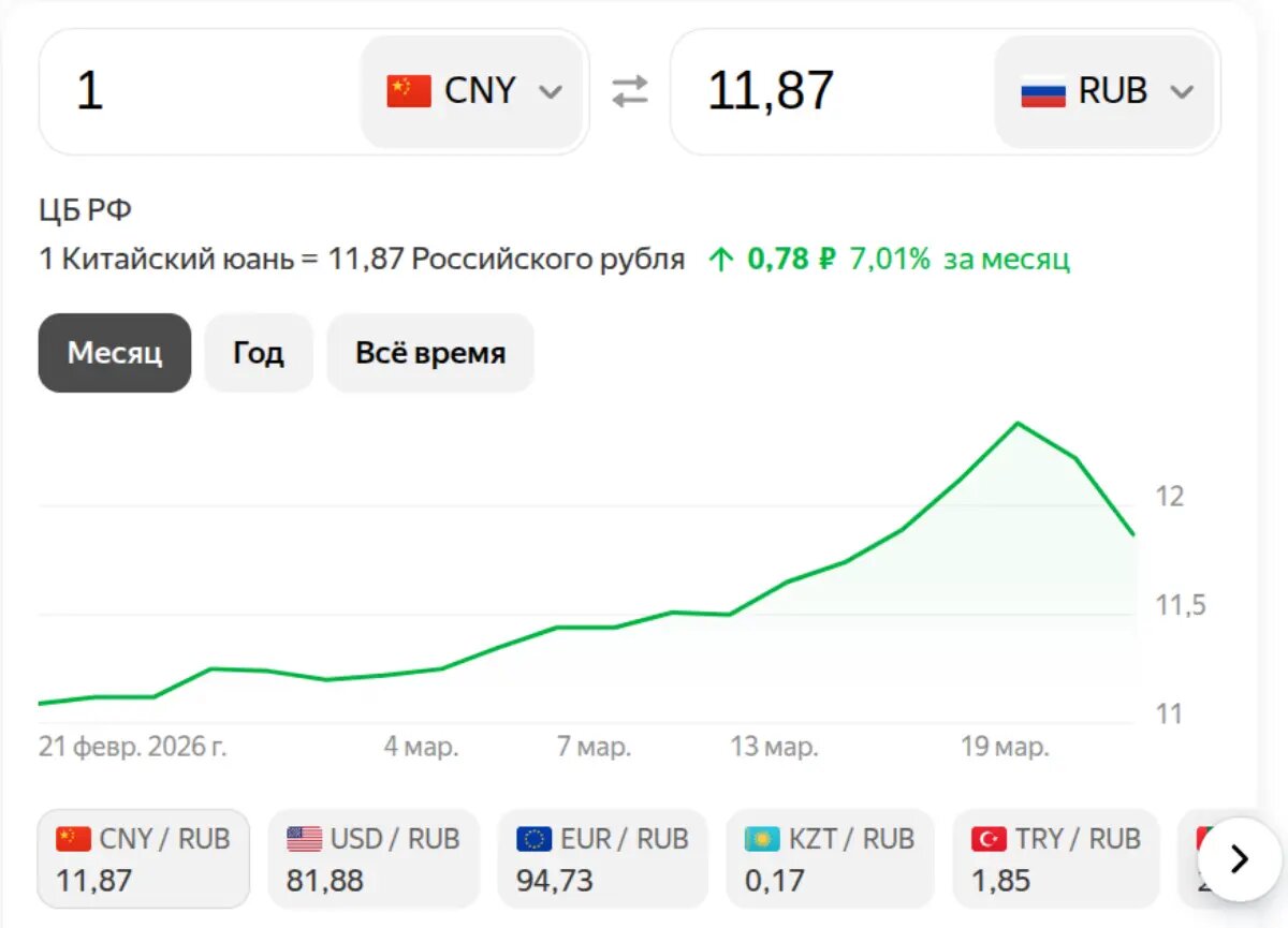 Курс юаня к рублю 24 марта 2026 года снизился до 11,87