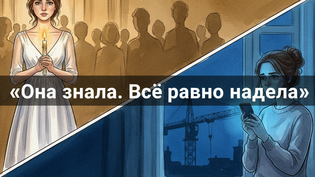 Свеча оплывала. Рита смотрела на неё и думала про среду. Священник говорил про верность и благодать, про испытания и терпение. Виктор стоял рядом, прямой, в сером костюме, и слушал с таким лицом, будто слова касались его и он принимал каждое. Рита тоже стояла прямо. Держала свечу двумя руками. «Клянёшься ли ты хранить верность...» Воск капнул ей на пальцы. Она не отдёрнула руку. * В среду вечером Виктор попросил позвонить Денису насчёт автобуса для гостей. «С моего позвони, там его номер в контактах», — сказал и ушёл в душ. Рита взяла его телефон. Нашла Дениса. Позвонила, договорилась, автобус на двенадцать. Положила телефон на стол — и увидела. Уведомление пришло пока она говорила. Имя незнакомое. «Я скучаю. Ты позвонишь сегодня?» В ванной шумела вода. Рита открыла переписку. Читала долго. Четыре минуты, может пять. Там было много сообщений. Не один день. Месяцы. Потом положила телефон туда, где он лежал. Отошла к окну. За окном шла стройка. Кран поворачивался медленно, без звука за