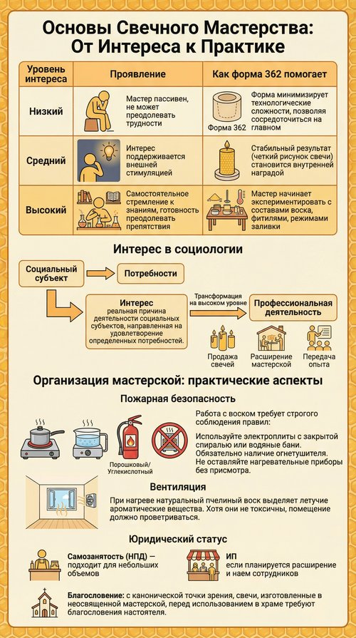 *Статья подготовлена на основе исторических данных о свечном ремесле эпохи Возрождения, философского и физического осмысления понятия «прошлое», психолого-педагогического понимания интереса и технологических особенностей изготовления витых свечей с использованием формы 362. Перед началом производственной деятельности рекомендуется получить консультацию по пожарной безопасности и юридическому оформлению бизнеса.*
