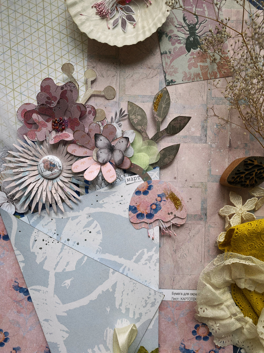 Весна - всегда время перерождения и начала новой жизни. Теперь я это знаю наверняка. Восьмого марта я получила свою заветную дизайнерскую коробочку с бумагой ТИМУД, и тут началась моя новая жизнь. Я вернулась в скрап, спустя очень долгое время, да ещё и в качестве дизайнера моего самого любимого бренда бумаги. От одной только мысли я порхаю бабочкой. А когда я увидела эту невероятной красоты бумагу, я просто улетела до небес. Сплошное вдохновение! Название новой коллекции «люби, лети, твори» определенно стало моим девизом этой весной! Я создала открытку в виде весеннего букета цветов, вырезанных полностью из листов коллекции «люби, лети, твори». Обернула цветы в идеальный серенький лист из коллекции «кусочек лета». Добавила немного лент и шитья, а внутри спрятала поздравление. А ещё среди цветочков спрятался милейший дружочек-котик. Также у меня сотворилась небольшая открыточка, посвященная чайному настроению и любви к ТИМУД. Фоновый листик и карт