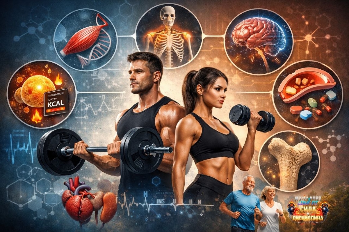 «красивое тело»)" Вот и мы решили поразмыслить над этим вопросом, ловите результат: С научной точки зрения силовые тренировки — это один из самых мощных инструментов для здоровья и долголетия. Что происходит в организме при регулярных занятиях в зале, рассмотрим по пунктам: — ↑ Мышечная масса С возрастом мы теряем мышцы (саркопения). Силовые тренировки замедляют этот процесс и напрямую связаны с увеличением продолжительности жизни. — ↑ Метаболизм Мышцы — энергозатратная ткань. Чем их больше, тем выше базовый расход калорий даже в покое. — ↑ Чувствительность к инсулину Регулярные тренировки снижают риск развития диабета 2 типа и помогают контролировать уровень сахара в крови. — ↑ Плотность костей Нагрузка стимулирует костную ткань → снижение риска остеопороза и переломов. — ↑ Гормональный баланс Улучшается выработка тестостерона, гормона роста и других регуляторов восстановления. — ↑ Работа мозга Физическая нагрузка улучшает когнитивные функции, память и снижает риск депре