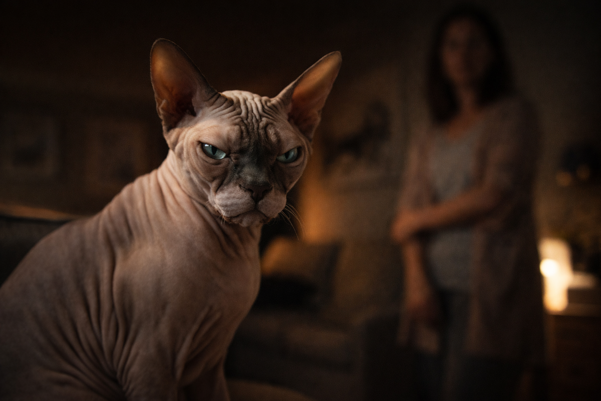 В другой семье сфинкс устроил трёхдневную моральную блокаду из-за того, что хозяин уехал в командировку, не попрощавшись как следует. Не потому что коту было страшно одному. Там дома оставались жена, дочь, плед, еда, подоконник, даже подогреваемый домик. Но нет. Принцип был нарушен. С ним не обсудили. Его не предупредили. Его оставили перед фактом, а сфинксы перед фактами капитулируют только внешне. Внутри они разворачивают знамя униженного достоинства.